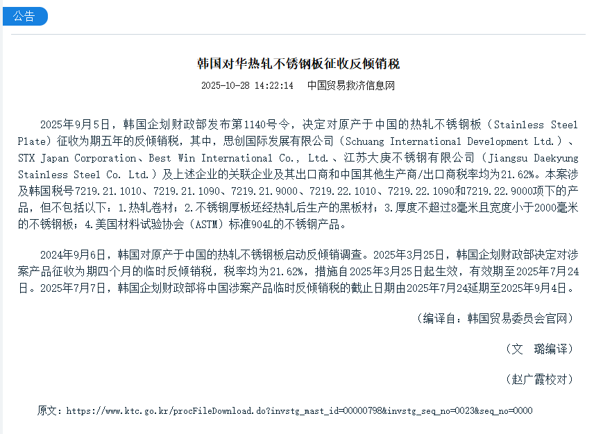 2025年10月28日,據中國貿易救濟信息網一則公告《韓國對華熱軋不銹鋼板征收反傾銷稅》顯示,“2025年9月5日,韓國企劃財政部發布第1140號令,決定對原產于中國的熱軋不銹鋼板(Stainless Steel Plate)征收為期五年的反傾銷稅,其中,思創國際發展有限公司(Schuang International Development Ltd.)、STX Japan Corporation、Best Win International Co., Ltd.、江蘇大庚不銹鋼有限公司(Jiangsu Daekyung Stainless Steel Co. Ltd.)及上述企業的關聯企業及其出口商和中國其他生產商/出口商稅率均為21.62%。本案涉及韓國稅號7219.21.1010、7219.21.1090、7219.21.9000、7219.22.1010、7219.22.1090和7219.22.9000項下的產品,但不包括以下:1.熱軋卷材;2.不銹鋼厚板坯經熱軋后生產的黑板材;3.厚度不超過8毫米且寬度小于2000毫米的不銹鋼板;4.美國材料試驗協會(ASTM)標準904L的不銹鋼產品。”