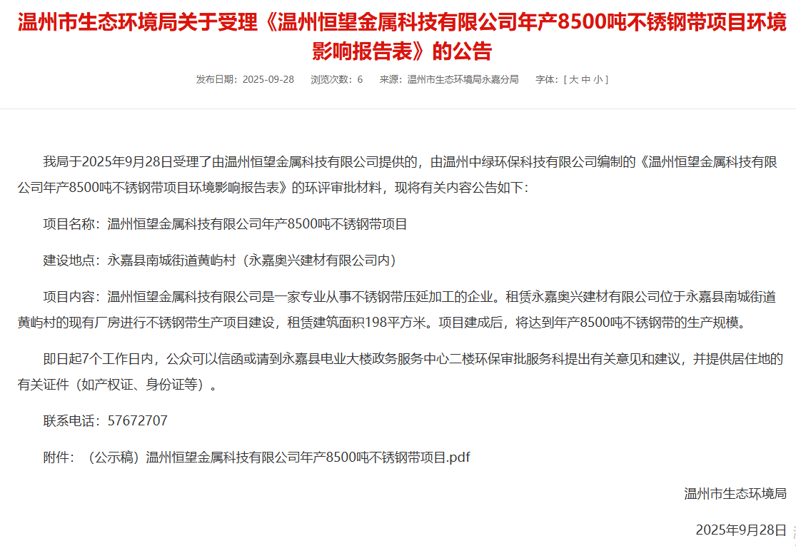 2025年9月28日,溫州市生態(tài)環(huán)境局受理溫州恒望金屬科技有限公司年產(chǎn)8500噸不銹鋼帶項(xiàng)目環(huán)境影響報(bào)告表并對(duì)外進(jìn)行公告,公告期:7個(gè)工作日。