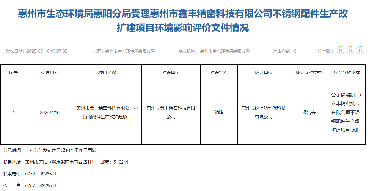 2025年7月15日,惠州市生態(tài)環(huán)境局惠陽分局受理惠州市鑫豐精密科技有限公司不銹鋼配件生產(chǎn)改擴(kuò)建項(xiàng)目環(huán)境影響評(píng)價(jià)文件并對(duì)外進(jìn)行公示,公示期:10個(gè)工作日。